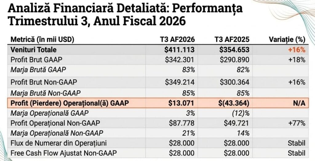 O realizare notabilă în acest trimestru a fost atingerea profitabilității GAAP, un indicator al disciplinei operaționale. Contrastul dintre cifrele GAAP și non-GAAP evidențiază progresul companiei.